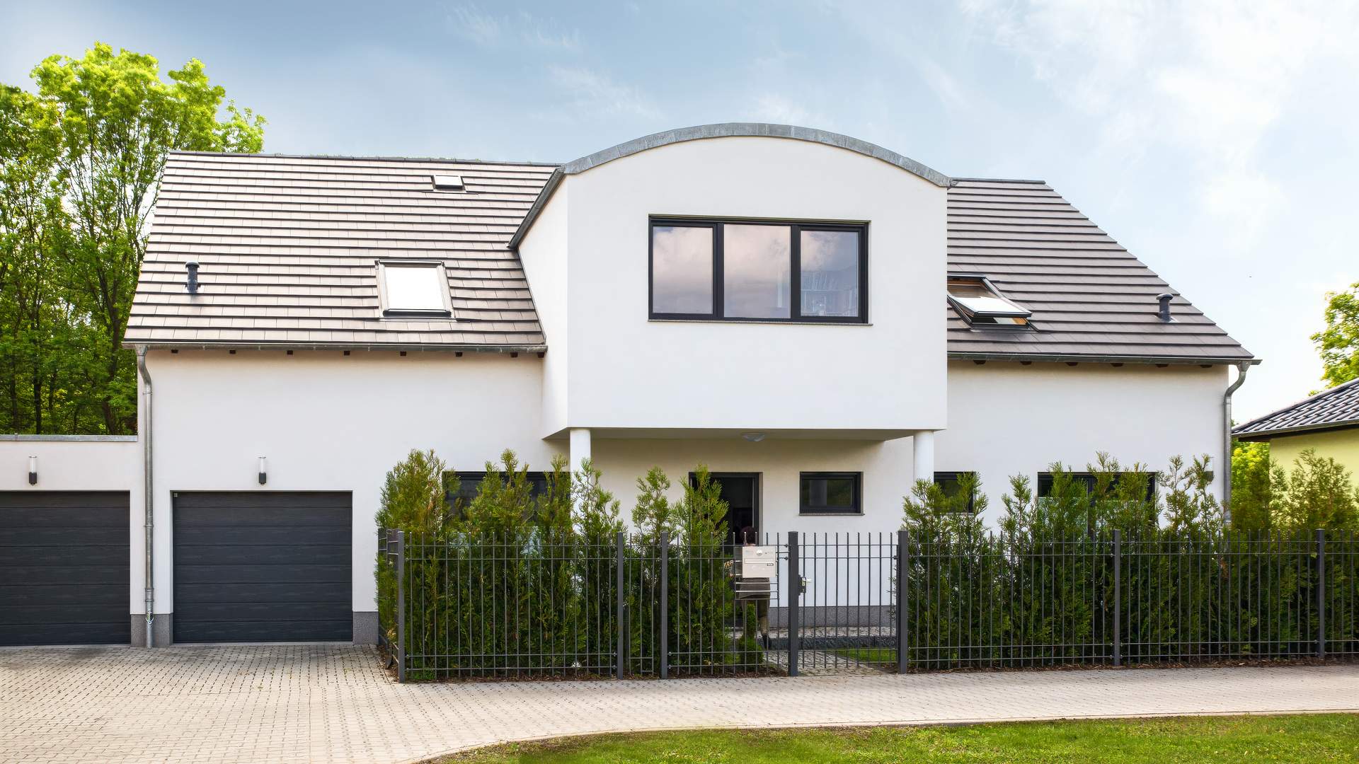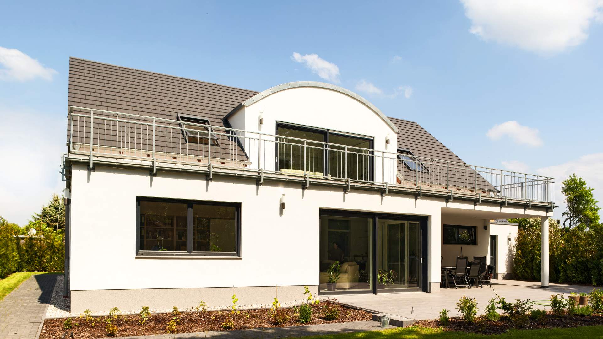 Dieses Einfamilienhaus in Leipzig beeindruckt auf den ersten Blick durch sein herausstehendes Tonnendach, das ihm sofort einen unverwechselbaren Charakter verleiht. Klar gegliederte Fassaden, reduzierte Formen und elegante Proportionen unterstreichen die zeitgemäße Gestaltung und schaffen eine ruhige, harmonische Ausstrahlung.